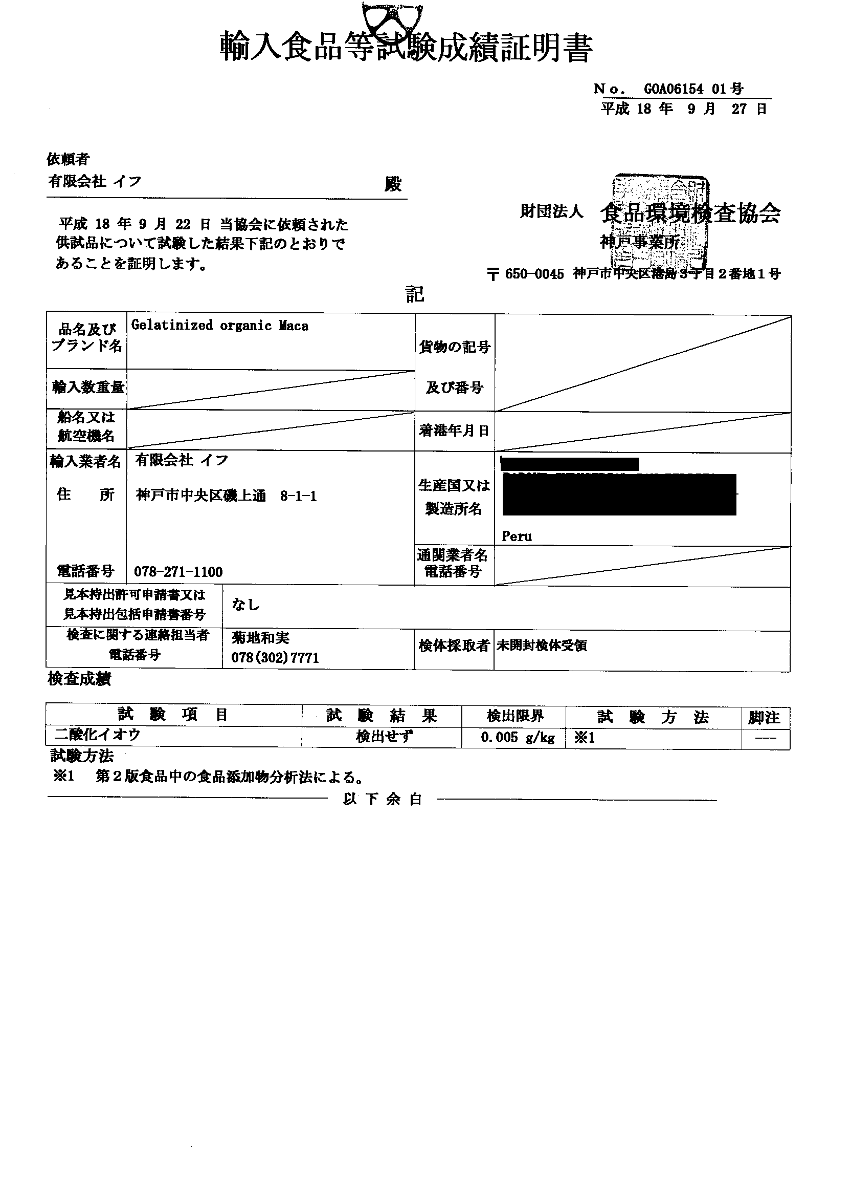弊社のマカはJAS認定基準(原料95%以上)に該当しないマカ・エキス粒をのぞいては、JAS認定商品(いわゆるJASマーク付き)です。放射線照射が行われた加工食品はJAS認定を受けることができません(有機加工食品の日本農林規格第4条)。